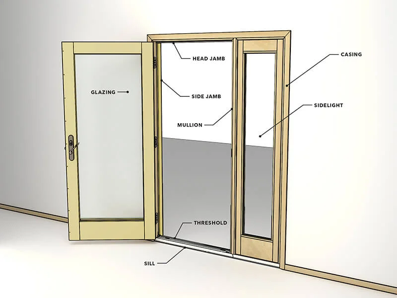 The surrounding case of a door, into which and out of which the door itself closes and opens. It consists of two upright pieces, called side jambs, and a horizontal head jamb. These three jambs have the “door stop” installed on them.