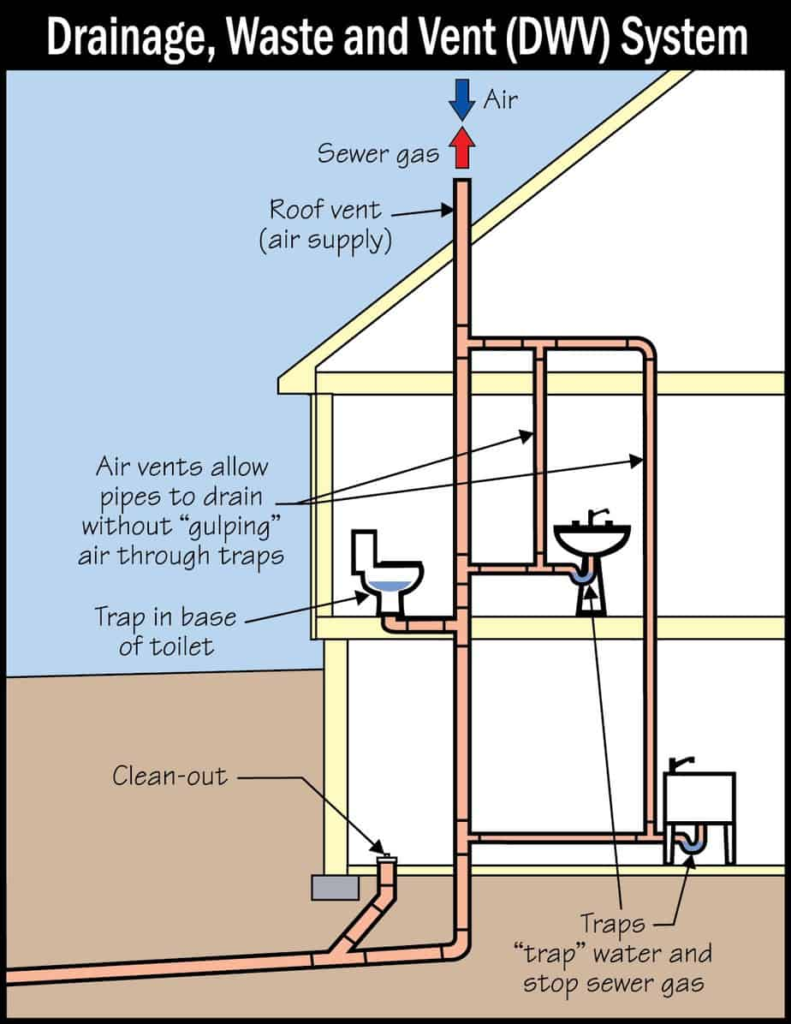 DWV (Drain-Waste-Vent) Suggest a termThe section of a plumbing system that carries water and sewer gases out of a home. Example: