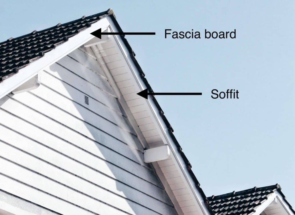 Horizontal boards attached to rafter/truss ends at the eaves and along gables. Roof drain gutters are attached to the fascia.