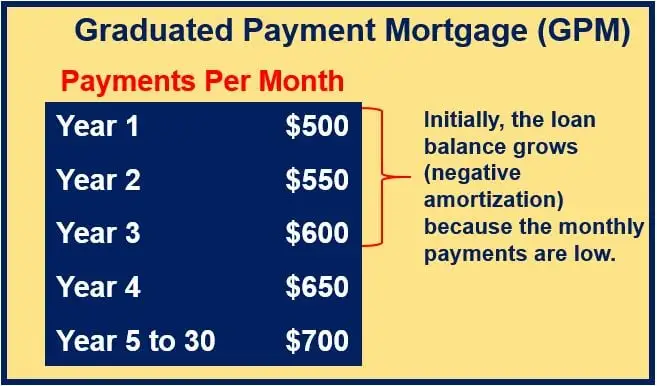 A fixed-rate, fixed-schedule loan. It starts with lower payments than a level payment loan; payments rise annually, with the entire increase being used to reduce the outstanding balance. The increase in payments may enable the borrower to pay off a 30-year loan in 15 to 20 years, or less.