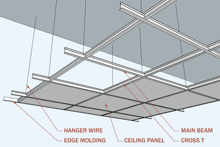 1. The completed assembly of main and cross tees in a suspended ceiling system before the ceiling panels are installed.
