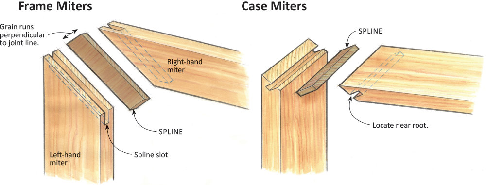 The joint of two pieces at an angle that bisects the joining angle. For example, the miter joint at the side and head casing at a door opening is made at a 45° angle.