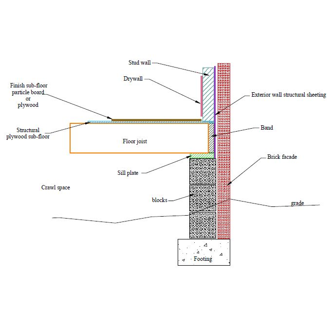 (1) The 2 X 4 or 2 X 6 wood plate framing member that lays flat against and bolted to the foundation wall (with anchor bolts) and upon which the floor joists are installed. Normally the sill plate is treated lumber.
