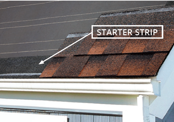 STARTER STRIP Suggest a termAsphalt roofing applied at the eaves that provides protection by filling in the spaces under the cutouts and joints of the first course of shingles. EXAMPLE: