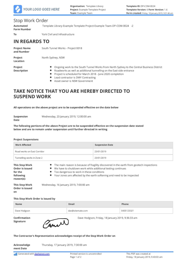 A formal, written notification to a contractor to discontinue some or all work on a project for reasons such as safety violations, defective materials or workmanship, or cancellation of the contract