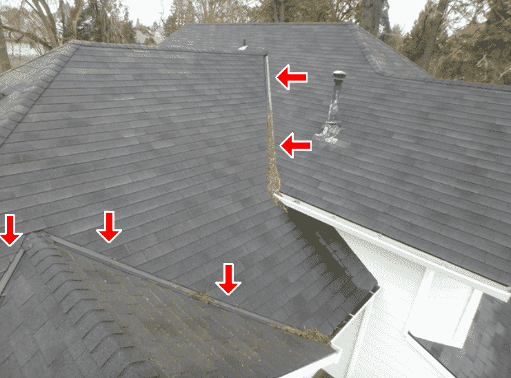 The “V” shaped area of a roof where two sloping roofs meet. Water drains off the roof at the valleys.