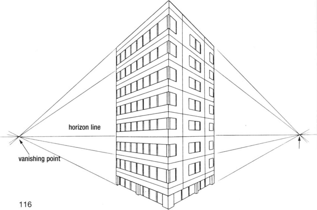 Here is an example of a perspective drawing with TWO vanishing points: