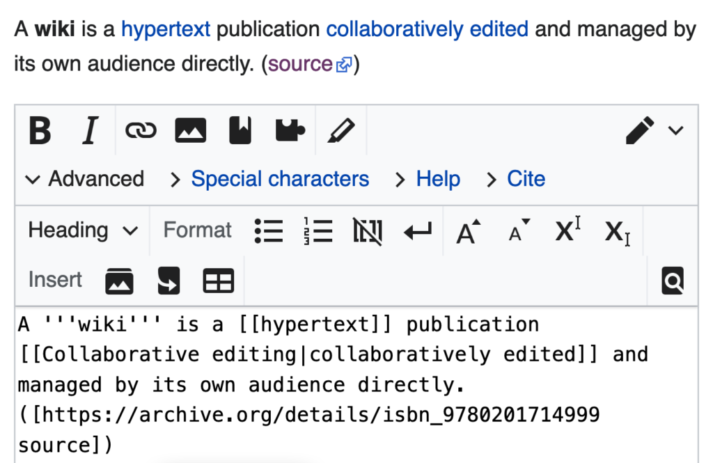 A wiki (pronounced /ˈwɪki/ WIK-ee) is a website that allows the easy[1] creation and editing of any number of interlinked web pages via a web browser using a simplified markup language. Wikis are typically powered by wiki software and are often used to create collaborative websites, to power community websites, for personal note taking, in corporate intranets, and in knowledge management systems. (Wikipedia.com)